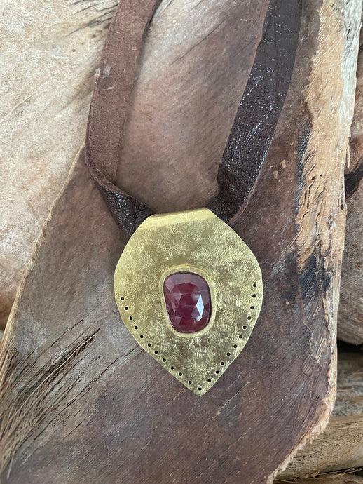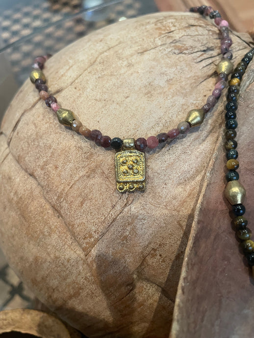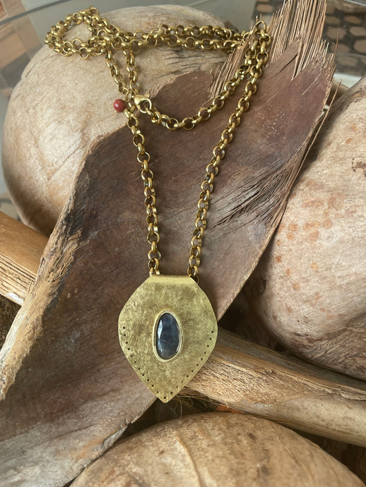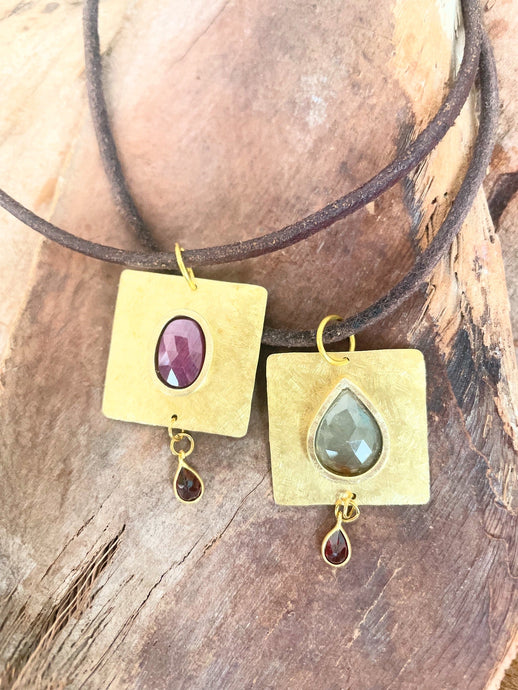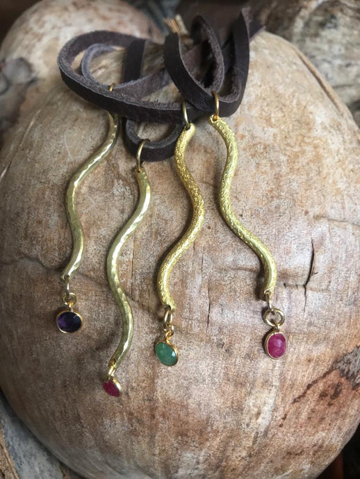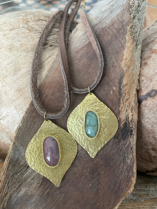 Collares y gargantillas hechas a mano con cuero, cadena y piedras naturales. Los colgantes se realizan artesanalmente en latón o bronce bañado en oro y se combinan con piedras naturales y semipreciosas. Al ser artesanal se pueden personalizar las piedras y los acabados. Todos los modelos de esta colección también pueden hacerse en plata o en oro por encargo. Consultar opciones.