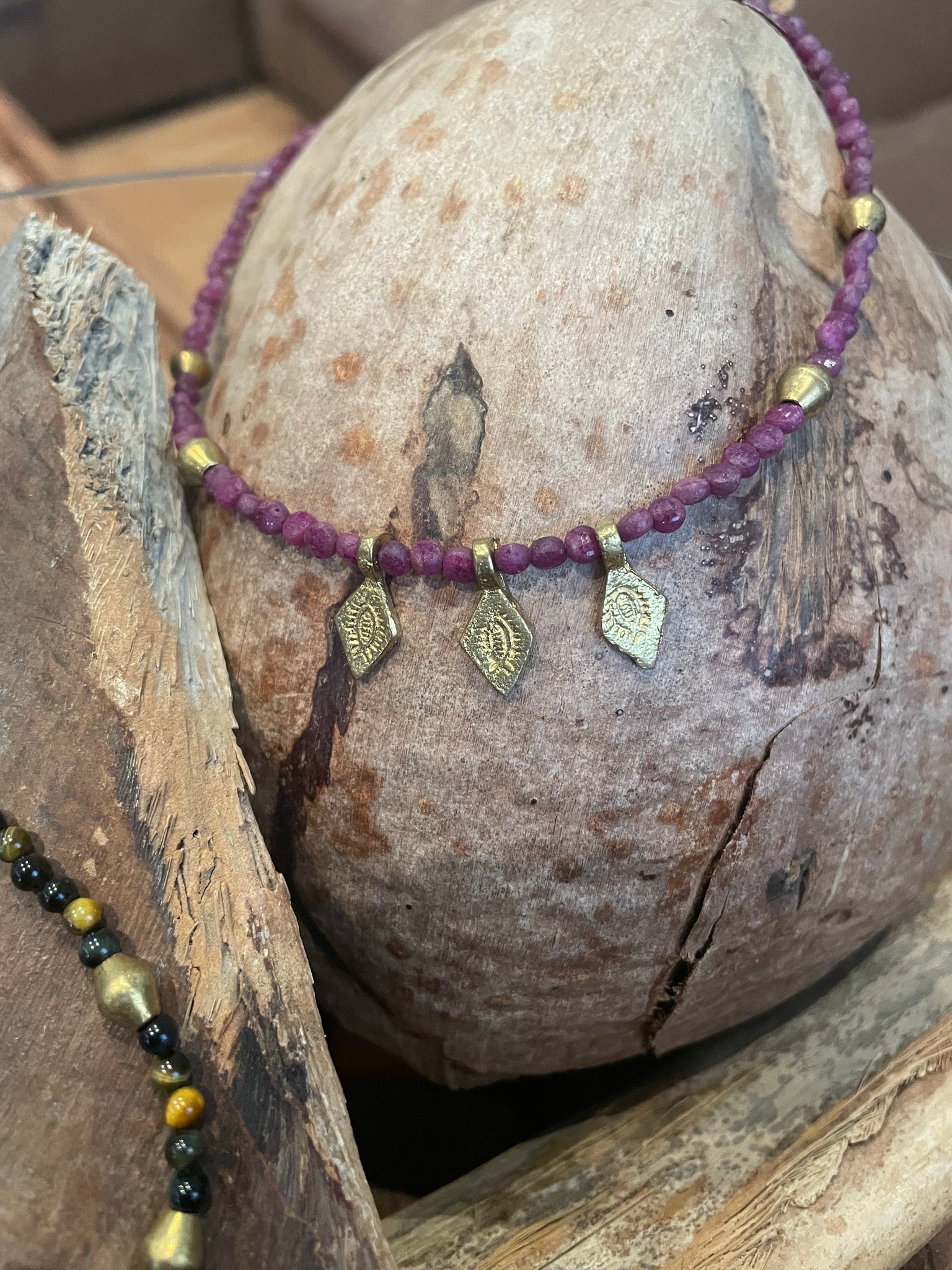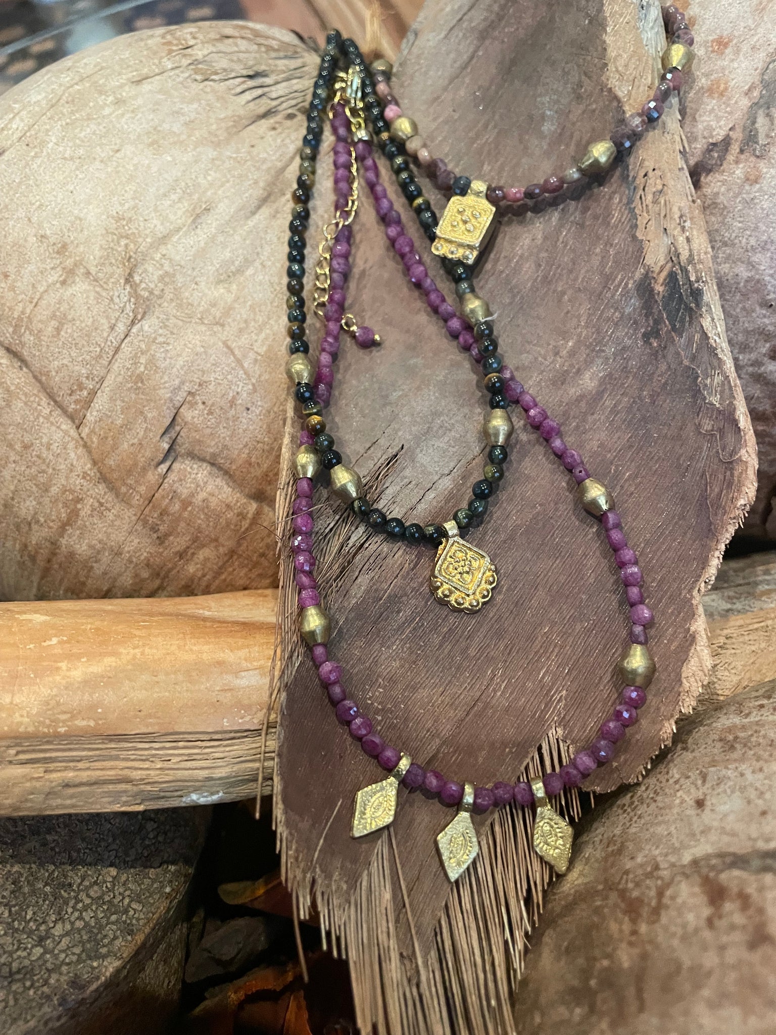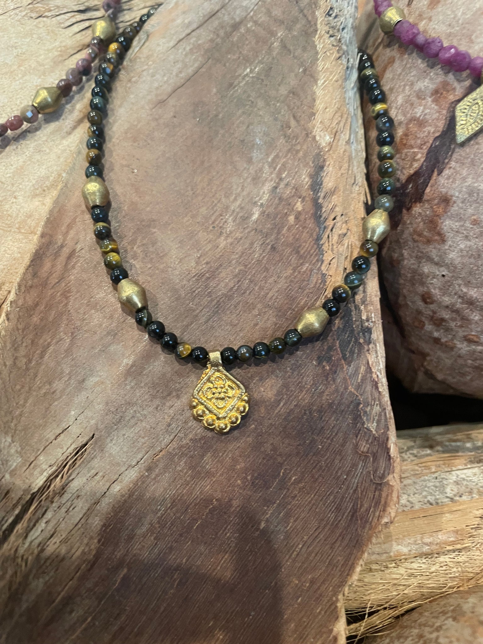 Gargantilla de piedras naturales con entre piezas y colgante de bronce. Disponible en tres combinaciones de piedra y colgantes.