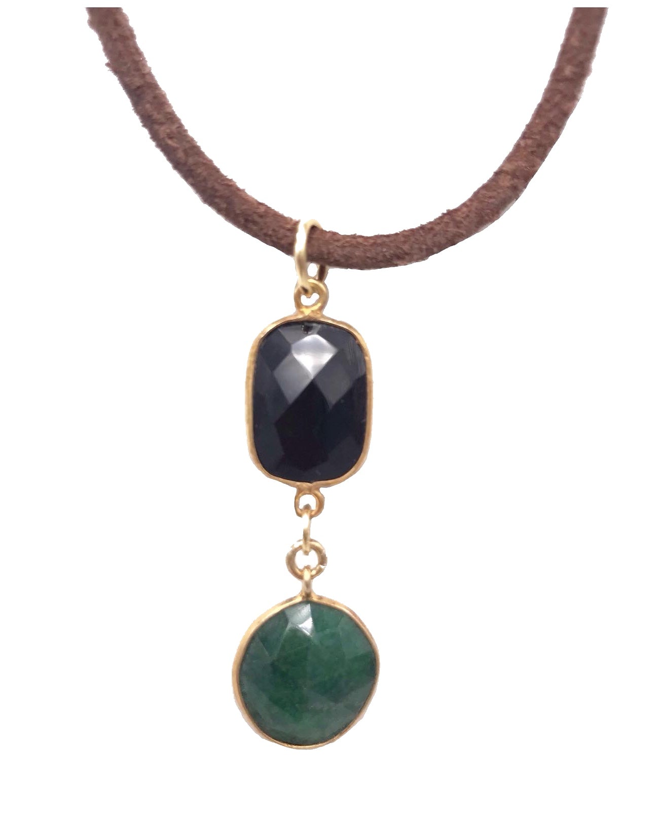Gargantilla de cuero natural con dos piedras naturales, onix y esmeralda, embatadas en plata bañada en oro.