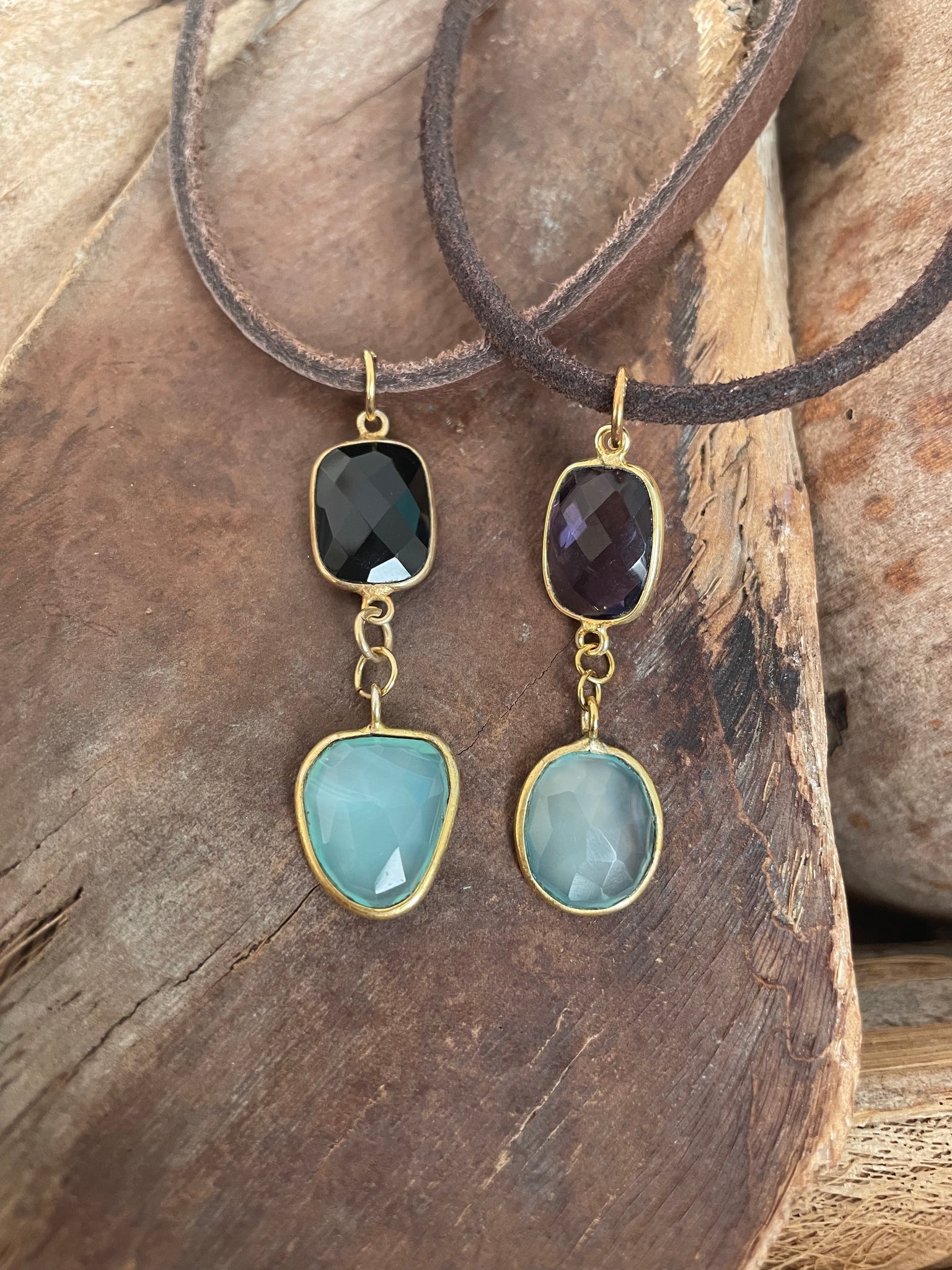 Gargantilla de cuero natural realizada con dos piedras naturales embatadas en plata bañada en oro. Se puede personalizar y hacer con otras combinaciones de piedra. Al ser piedras naturales, el color y forma de las piedras puede variar algo respecto al de la foto. Consultar opciones.
