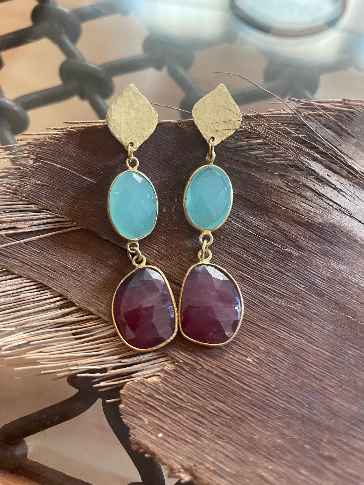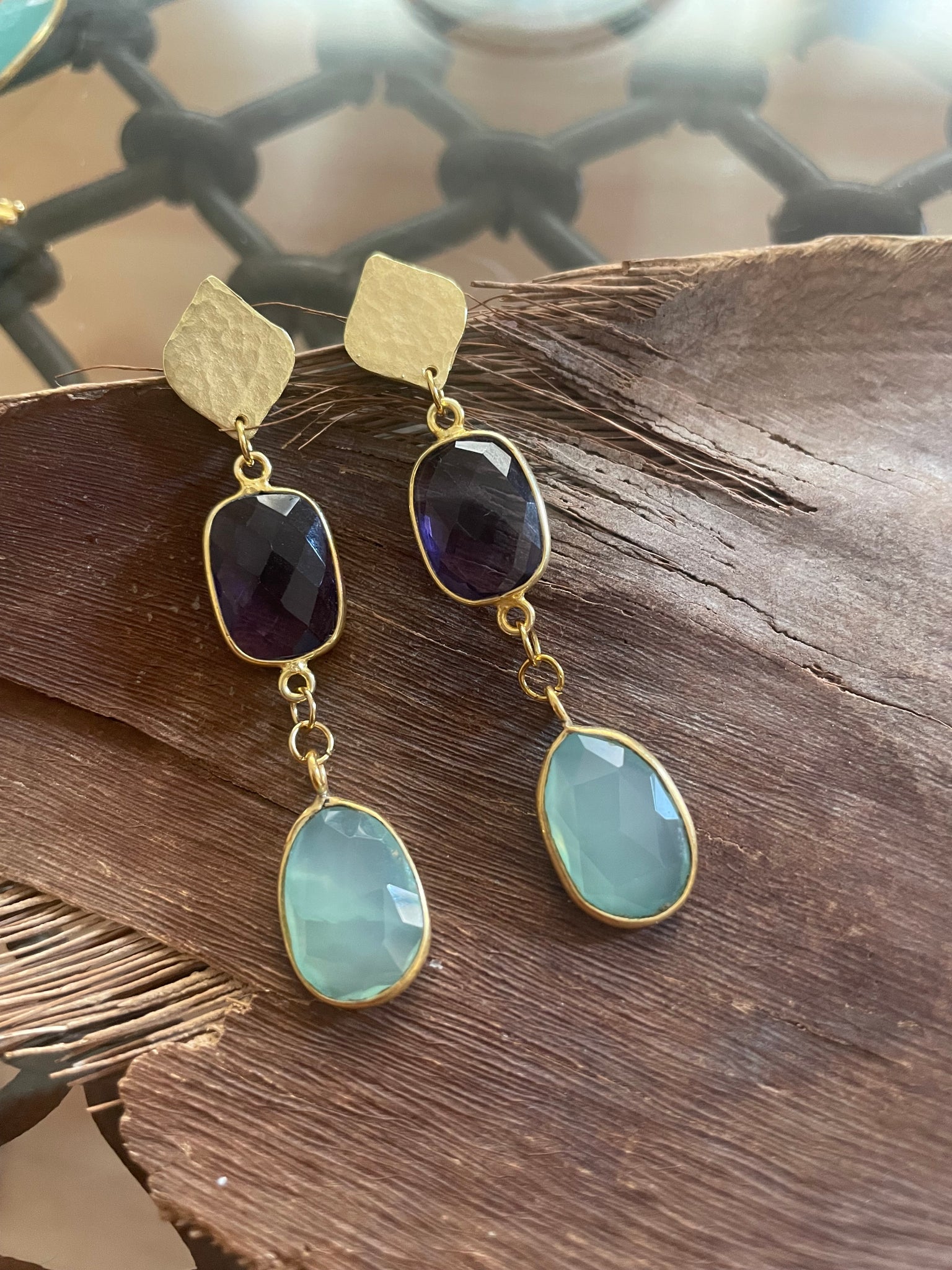 Pendientes realizados con dos piedras naturales embatadas en plata 925 bañada en oro (calcedonia, y piedra luna, amatista y calcedonia, onix y calcedonia) ). Se pueden personalizar escogiendo el color y tipo de piedra natural. El precio puede variar en función de las piedras escogidas. Consultar opciones.