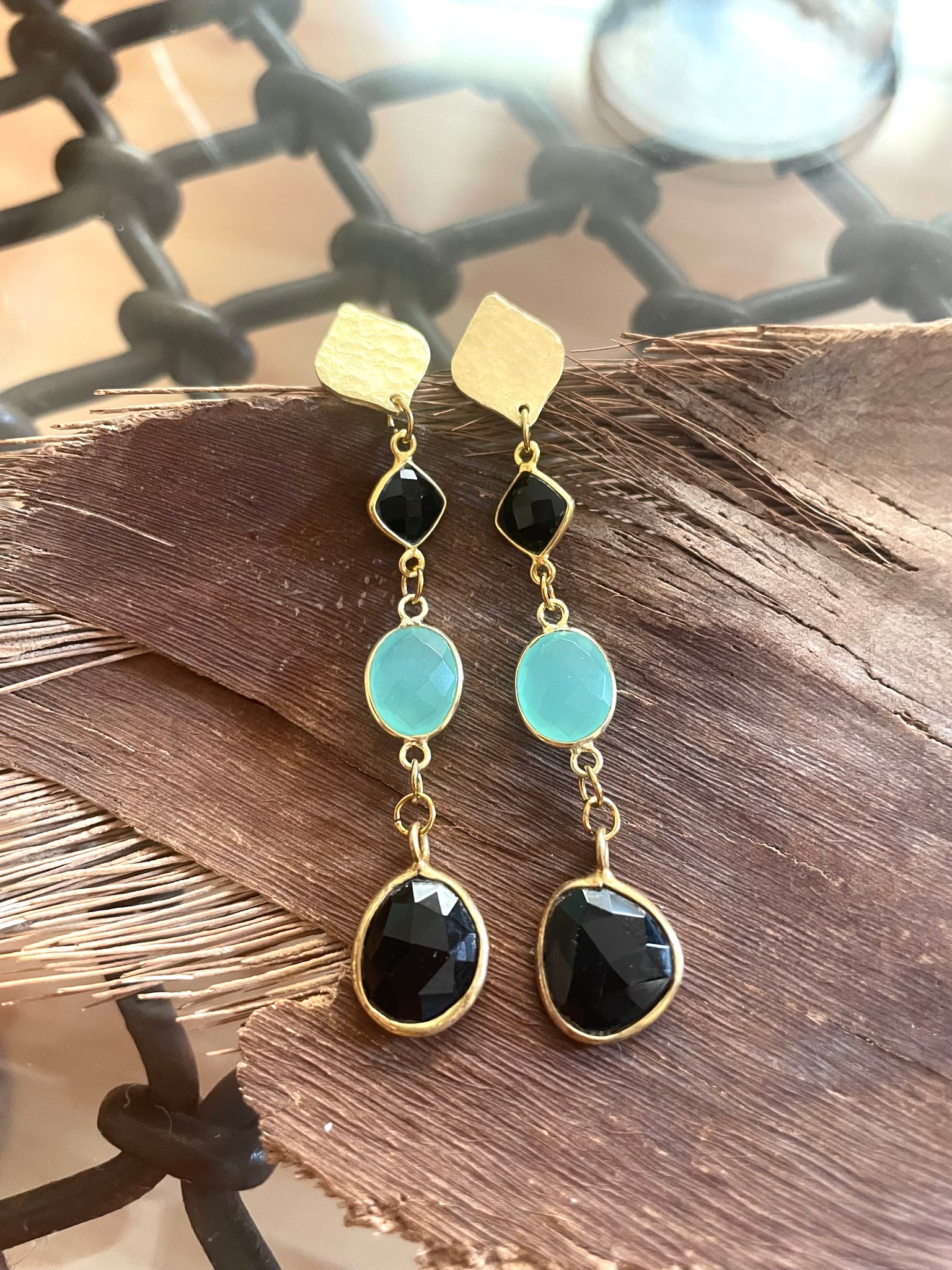 Pendiente con tres piedras naturales embatadas en plata 925 bañada en oro (calcedonia, cornalina, ágatas, piedra luna...). Se pueden personalizar escogiendo el color y tipo de piedra natural, así como la combinación de colores. El precio puede variar en función de las piedras escogidas. Consultar opciones.